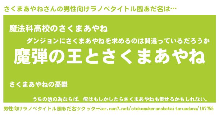 | 女子向けラノベタイトル風あだ名 | 『乙女ゲームの破滅フラグしかない悪役さくまあやねに転生してしまった…』 |