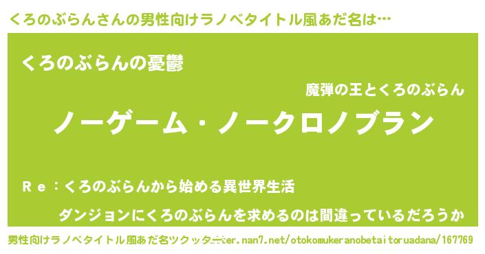 | 女子向けラノベタイトル風あだ名 | 『死神くろのぶらんの再婚』 |