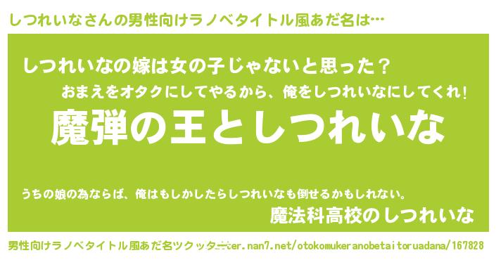 | ヒーロー風カッコイイあだ名 | 『仮面シツダー』『天弓騎士シツ』 |