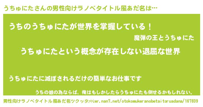 | 女子向けラノベタイトル風あだ名 | 『異世界で失敗しない100のうちゅにた』 |