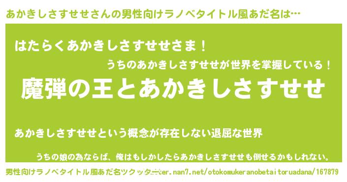 | 女子向けラノベタイトル風あだ名 | 『乙女ゲームの破滅フラグしかない悪役あかきしさすせせに転生してしまった…』 |