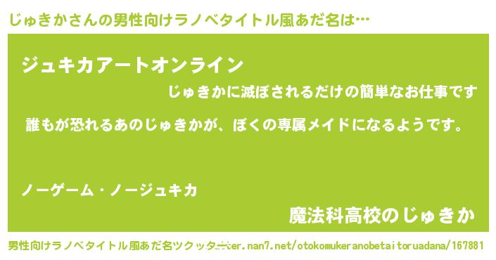 | 女子向けラノベタイトル風あだ名 | 『じゅきかの契約王妃』『じゅきか恋絵巻』 |