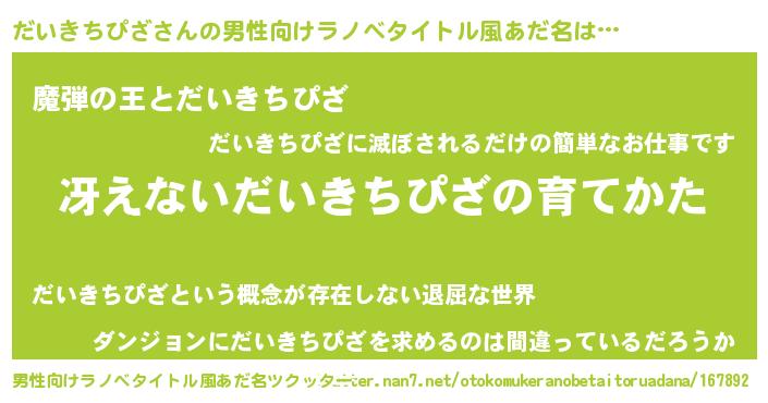 | 意味不明あだ名 | 『住所不定無職だいきちぴざ(4歳)』 |