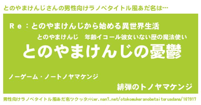| 女子向けラノベタイトル風あだ名 | 『(仮)とのやまけんじのやんごとなき事情』 |