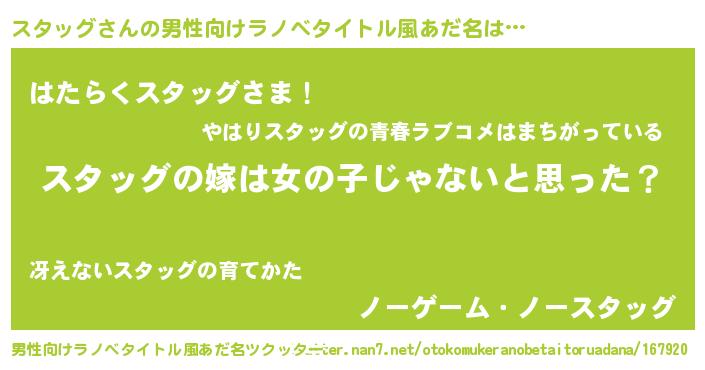 | 女子向けラノベタイトル風あだ名 | 『スタッグの卵を拾いまして』 |