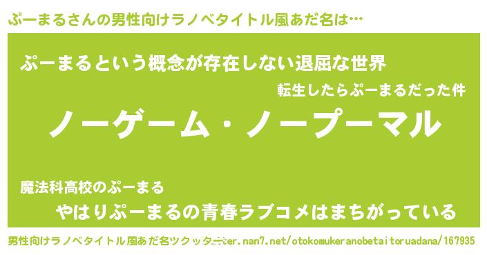 | 女子向けラノベタイトル風あだ名 | 『死神ぷーまるの再婚』 |