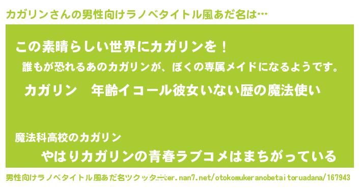 | 女子向けラノベタイトル風あだ名 | 『カガリンの玉の輿計画!』 |