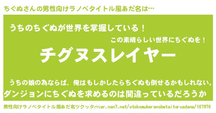 | 胡散臭い通販商品みたいなあだ名 | 『信頼と実績のサプリメント…その名も「ちぐぬ」』 |