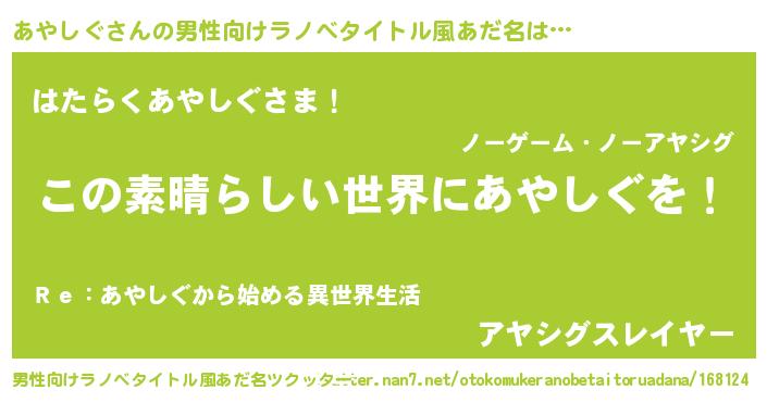 | 女子向けラノベタイトル風あだ名 | 『悪役あやしぐに転生したようですが、知った事ではありません』 |