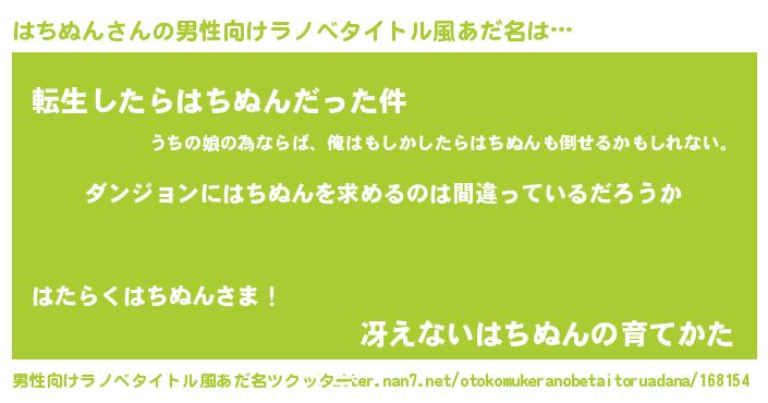 | 女子向けラノベタイトル風あだ名 | 『はちぬんの卵を拾いまして』 |