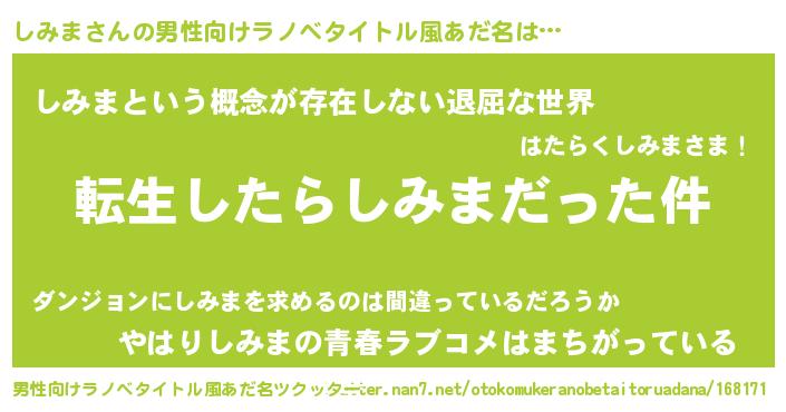 | 女子向けラノベタイトル風あだ名 | 『しみまの玉の輿計画!』 |