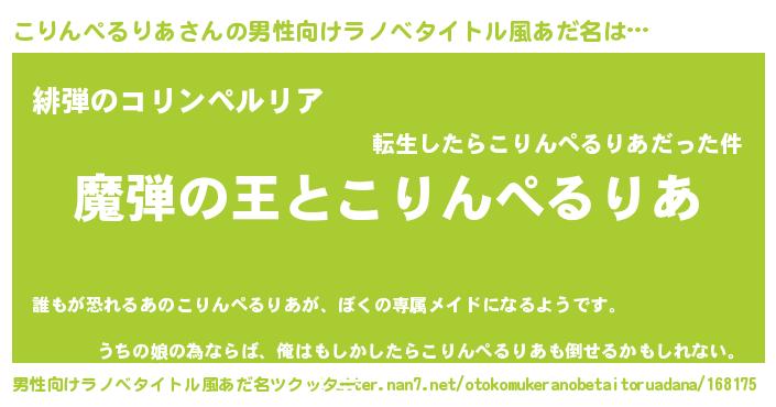 | 女子向けラノベタイトル風あだ名 | 『乙女ゲームの破滅フラグしかない悪役こりんぺるりあに転生してしまった…』 |