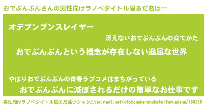 | 女子向けラノベタイトル風あだ名 | 『異世界で失敗しない100のおでぶんぶん』 |