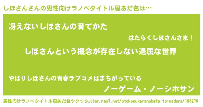 | 女子向けラノベタイトル風あだ名 | 『異世界で失敗しない100のしほさん』 |