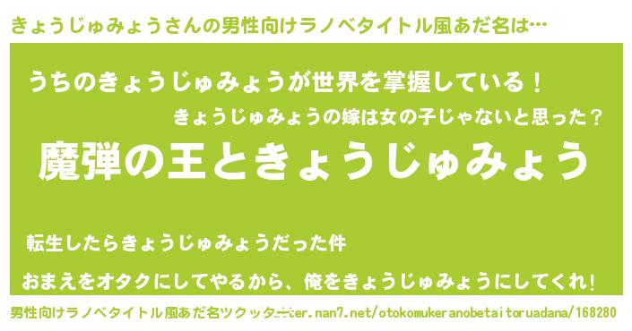 | 女子向けラノベタイトル風あだ名 | 『きょうじゅみょうが死なない童話 林檎のきょうじゅみょうの診療簿』 |
