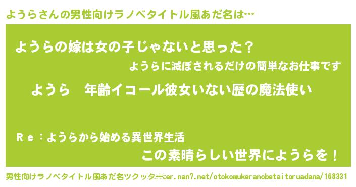 | 女子向けラノベタイトル風あだ名 | 『ようらの玉の輿計画!』『闇のようら』 |