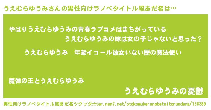 | 女子向けラノベタイトル風あだ名 | 『うえむらゆうみの玉の輿計画!』 |
