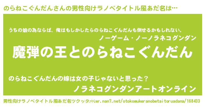| 女子向けラノベタイトル風あだ名 | 『乙女ゲームの破滅フラグしかない悪役のらねこぐんだんに転生してしまった…』 |