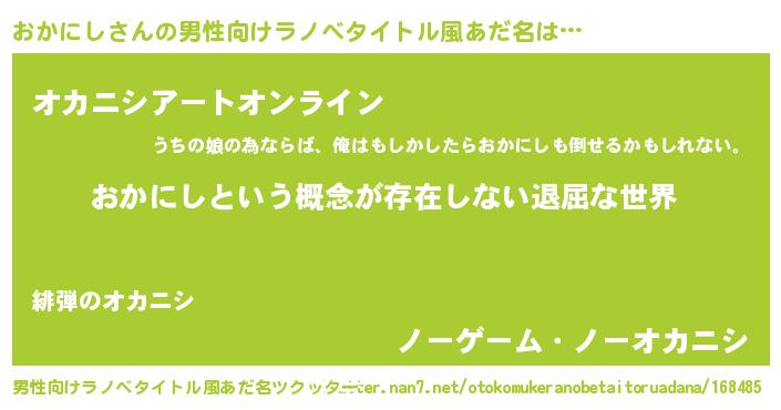 | 女子向けラノベタイトル風あだ名 | 『異世界で失敗しない100のおかにし』 |