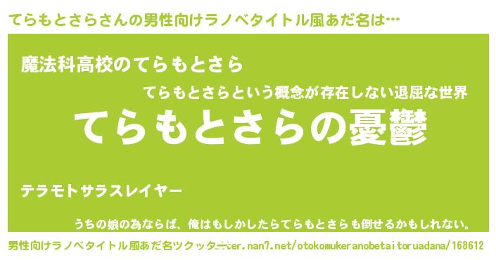 | 女子向けラノベタイトル風あだ名 | 『(仮)てらもとさらのやんごとなき事情』 |