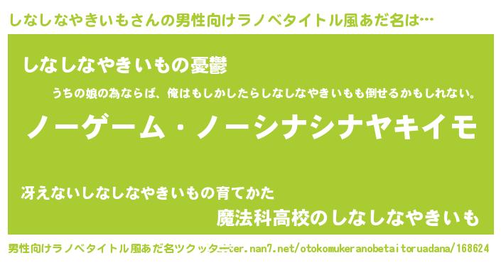| 女子向けラノベタイトル風あだ名 | 『死神しなしなやきいもの再婚』 |