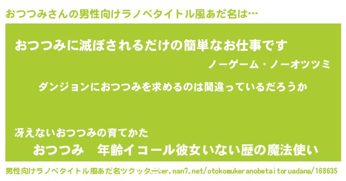 | 女子向けラノベタイトル風あだ名 | 『おつつみの卵を拾いまして』 |