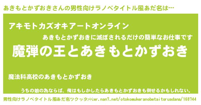 | 女子向けラノベタイトル風あだ名 | 『乙女ゲームの破滅フラグしかない悪役あきもとかずおきに転生してしまった…』 |