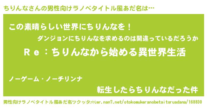 | 女子向けラノベタイトル風あだ名 | 『闇のちりんな』『ちりんなは平凡を望む』 |