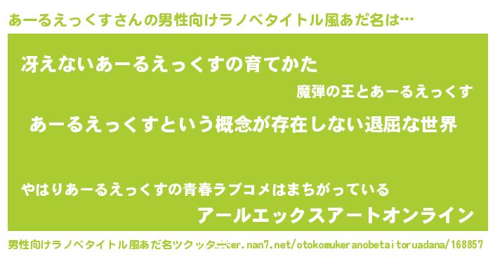 | 胡散臭い通販商品みたいなあだ名 | 『来世でも幸せになれる水素水…その名も「あーるえっくす」』 |