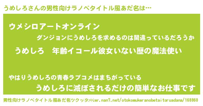| 女子向けラノベタイトル風あだ名 | 『うめしろの玉の輿計画!』 |
