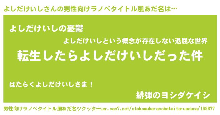 | 女子向けラノベタイトル風あだ名 | 『よしだけいしの玉の輿計画!』 |