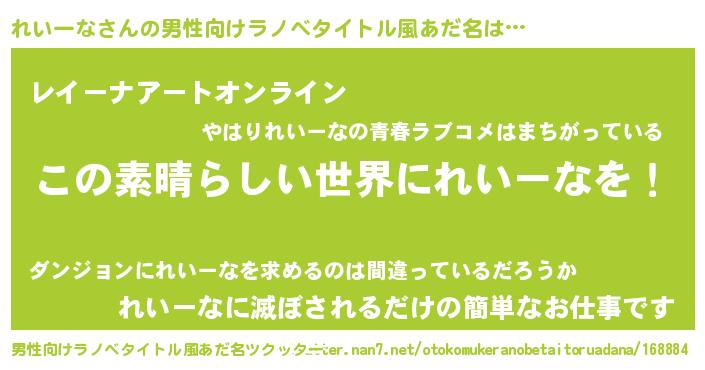| 女子向けラノベタイトル風あだ名 | 『乙女ゲームの破滅フラグしかない悪役れいーなに転生してしまった…』 |
