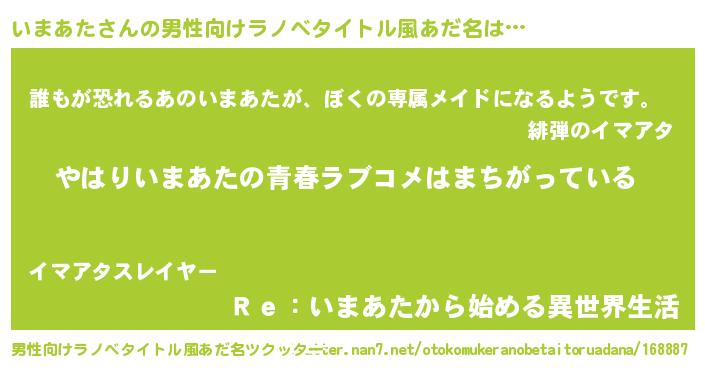| 女子向けラノベタイトル風あだ名 | 『いまあたの雑貨屋さん』『闇のいまあた』 |
