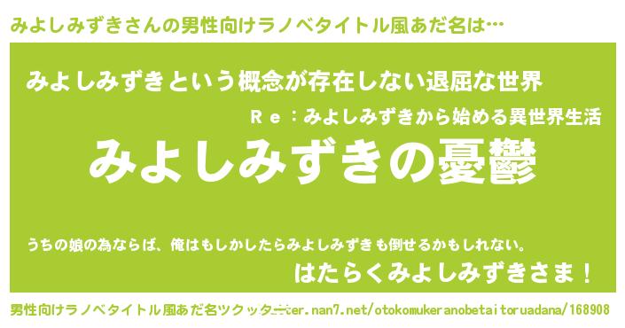 | 女子向けラノベタイトル風あだ名 | 『(仮)みよしみずきのやんごとなき事情』 |