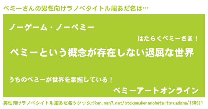 | 女子向けラノベタイトル風あだ名 | 『ペミーの契約王妃』『ペミー恋絵巻』 |