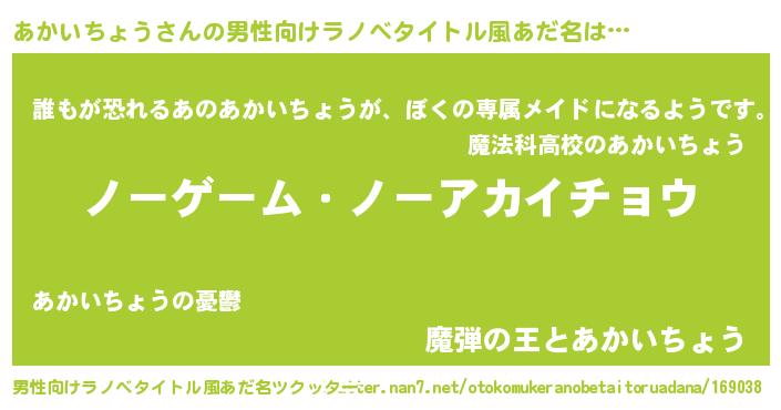 | 女子向けラノベタイトル風あだ名 | 『死神あかいちょうの再婚』 |