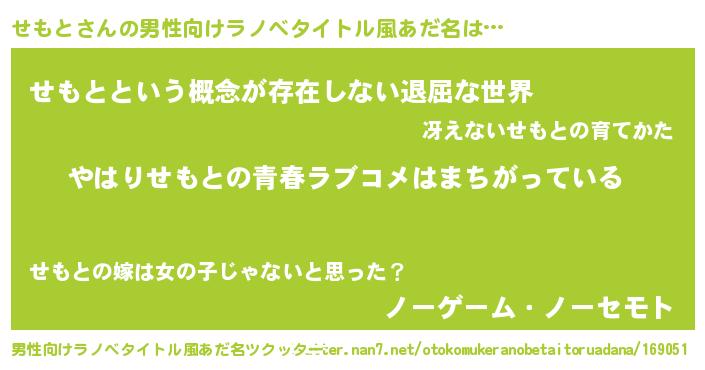 | 女子向けラノベタイトル風あだ名 | 『せもと伯爵の花嫁』『せもとの契約王妃』 |
