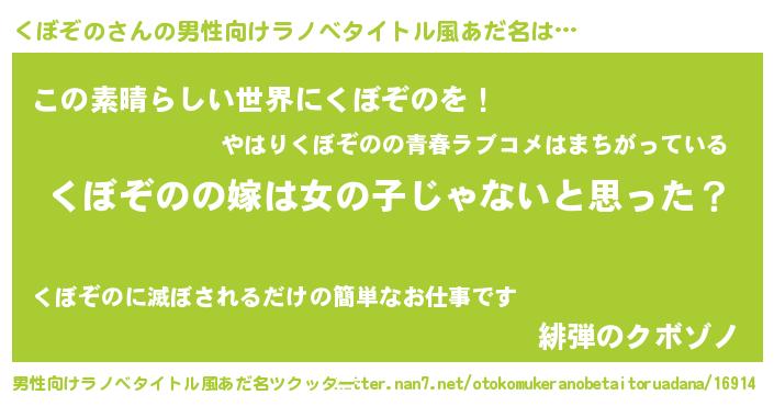 | 女子向けラノベタイトル風あだ名 | 『くぼぞのの卵を拾いまして』 |