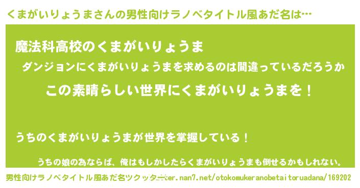 | 女子向けラノベタイトル風あだ名 | 『乙女ゲームの破滅フラグしかない悪役くまがいりょうまに転生してしまった…』 |