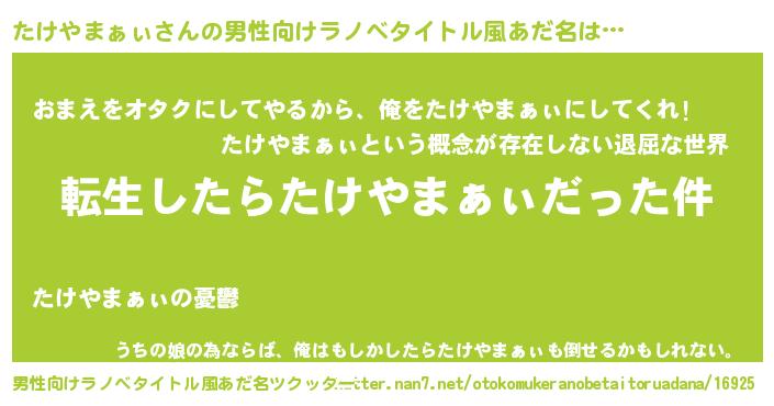 | 女子向けラノベタイトル風あだ名 | 『たけやまぁぃの玉の輿計画!』 |