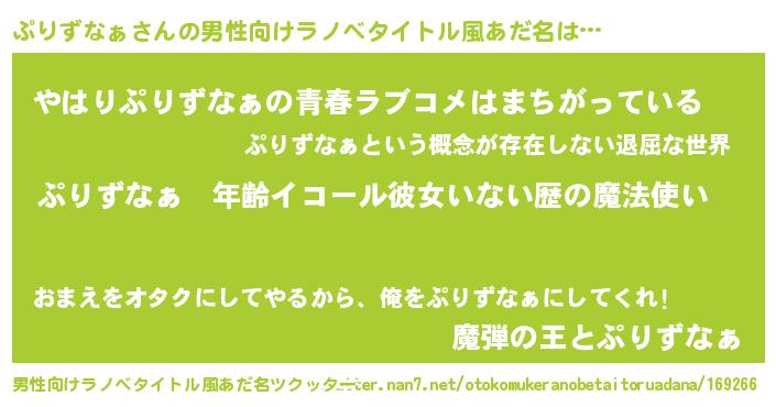 | 女子向けラノベタイトル風あだ名 | 『ぷりずなぁの玉の輿計画!』 |
