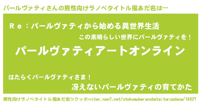 | 女子向けラノベタイトル風あだ名 | 『誰かこのパールヴァティを説明してください! ~契約から始まるウェディング~』 |