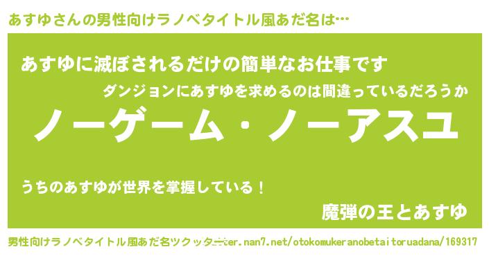 | 女子向けラノベタイトル風あだ名 | 『死神あすゆの再婚』 |