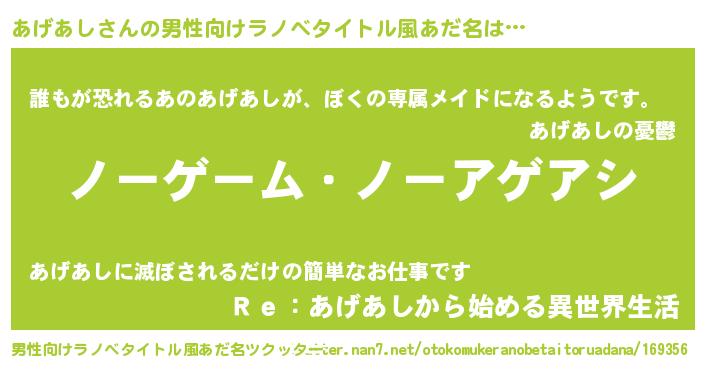 | 女子向けラノベタイトル風あだ名 | 『死神あげあしの再婚』『闇のあげあし』 |