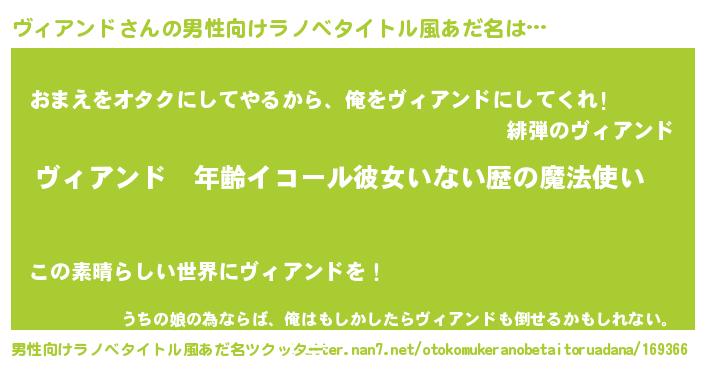 | 女子向けラノベタイトル風あだ名 | 『ヴィアンドの玉の輿計画!』 |