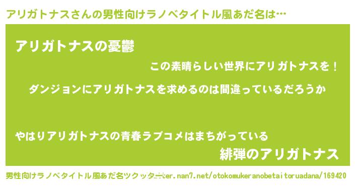 | 胡散臭い通販商品みたいなあだ名 | 『信頼と実績のサプリメント…その名も「アリガトナス」』 |