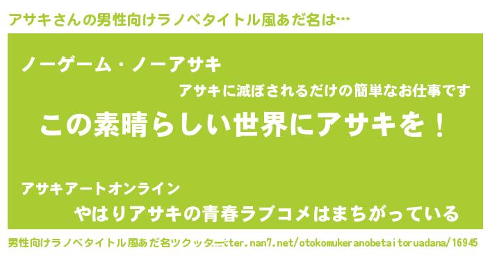 | 胡散臭い通販商品みたいなあだ名 | 『あなたにだけ特別に提供する100年もののヴィンテージワイン…その名も「アサキ」』 |