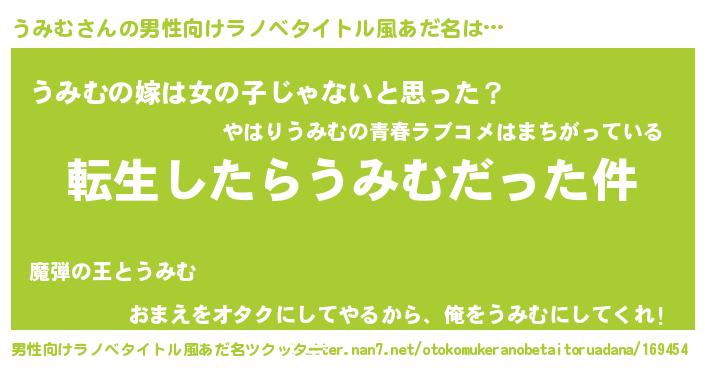 | 女子向けラノベタイトル風あだ名 | 『婚約破棄系悪役うみむに転生したので、保身に走りました。』 |