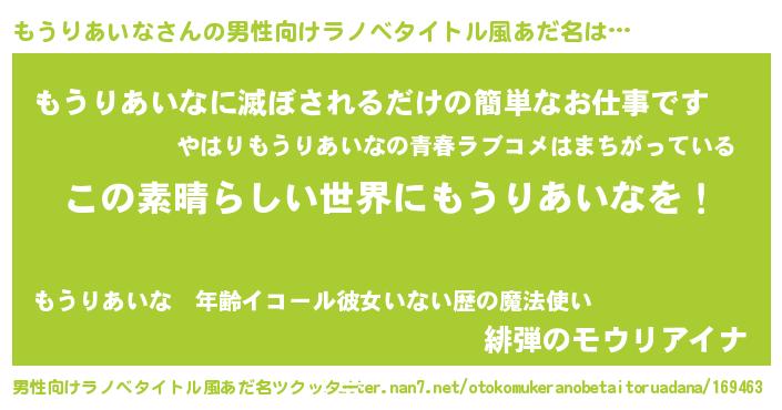 | 胡散臭い通販商品みたいなあだ名 | 『世界中を虜にした100年もののヴィンテージワイン…その名も「もうりあいな」』 |