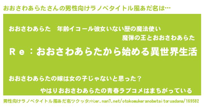| 女子向けラノベタイトル風あだ名 | 『闇のおおさわあらた』 |